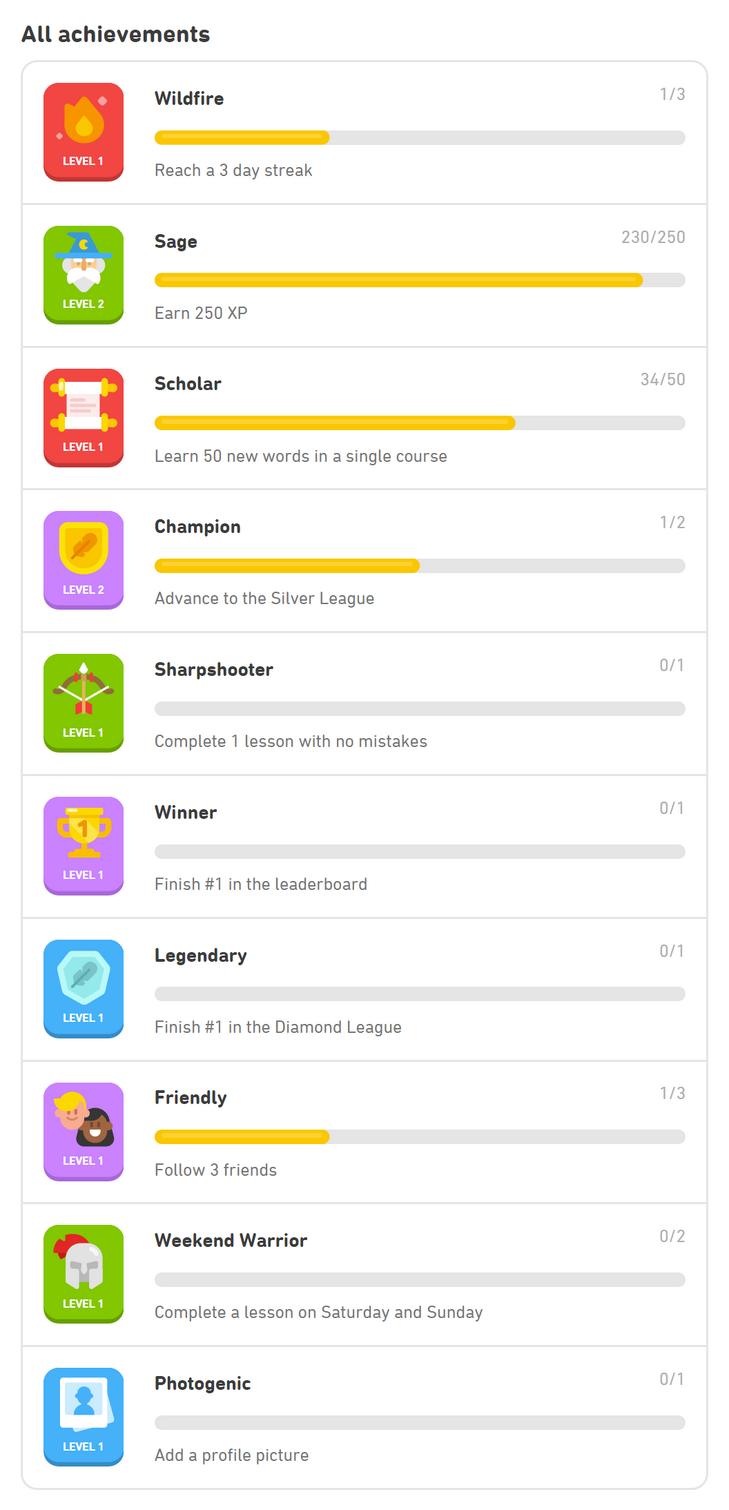 You can skip through the levels by successfully . Did you know you can now progress faster by testing out of skill levels on duolingo? However, i found that as i moved forward and unlocked new levels, . With duolingo there are different levels that you have to progress through to unlock more lessons. When you start learning sentences, we will always provide you with multiple options at a range of difficulty levels, so that you can pick the . As lessons are completed, learners earn virtual points (which unlock levels). @duolingo i have completed all 5 tests on level 3 & want to progress to level 4. New initiatives and future outlook. Tinycards uses spaced repetition and . But a lot of people wonder if duolingo is a waste of time? It's the most popular language learning app right now. I have finished ch3 and now i can't open ch4. Are they the ones further down in the course?