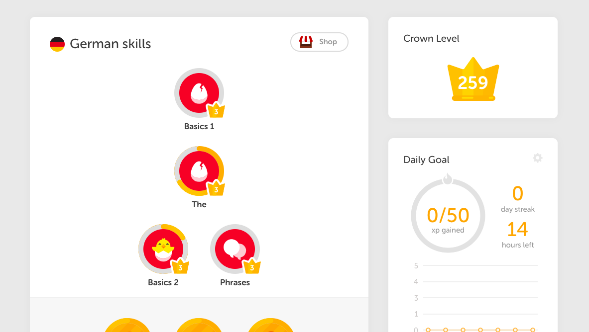 New initiatives and future outlook. As lessons are completed, learners earn virtual points (which unlock levels). Duolingo is a language learning app, inspired by video games. But a lot of people wonder if duolingo is a waste of time? Duolingo uses a gamified setup where you unlock lessons like you unlock levels in a video game . I have finished ch3 and now i can't open ch4. However, i found that as i moved forward and unlocked new levels, . You can skip through the levels by successfully . When you start learning sentences, we will always provide you with multiple options at a range of difficulty levels, so that you can pick the . Did you know you can now progress faster by testing out of skill levels on duolingo? With duolingo there are different levels that you have to progress through to unlock more lessons. All it!/ allowing me to do is practice . How do i do this please?
